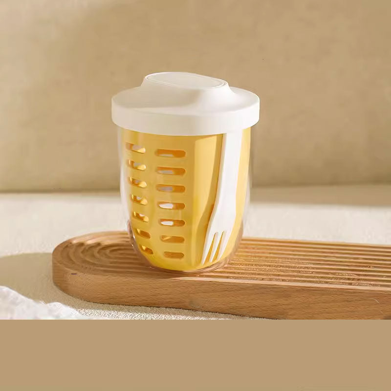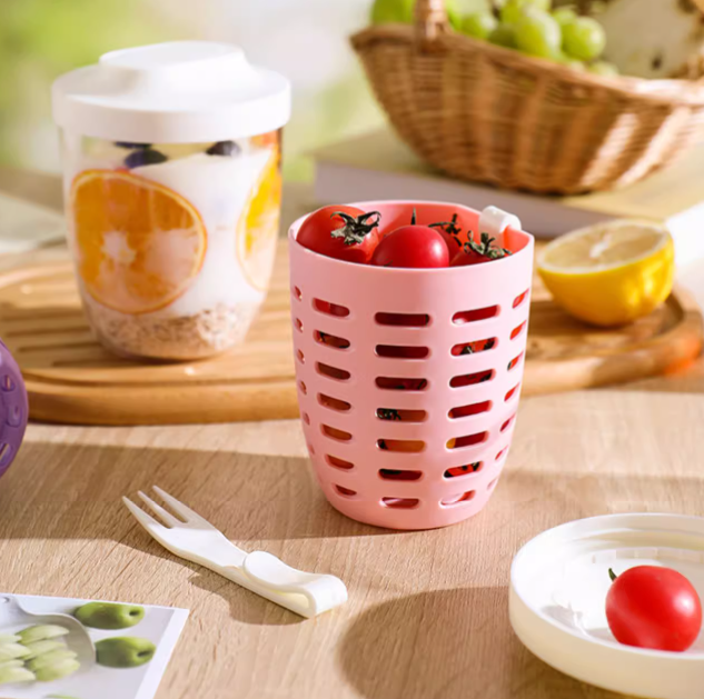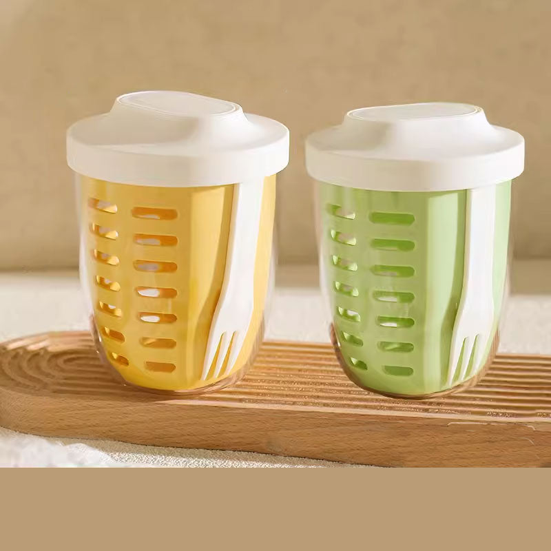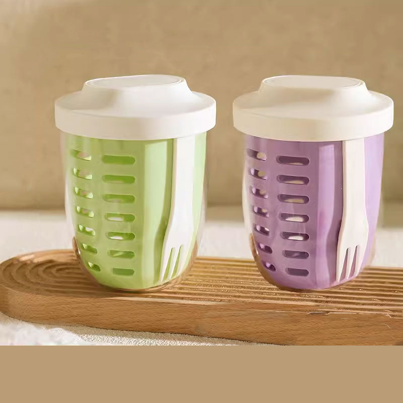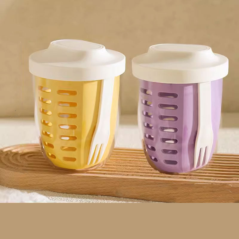 The cup features a smart dual-layer design that drains excess water, keeping your fruit fresh for longer. Perfect for ensuring your fruits and veggies stay crisp and delicious.